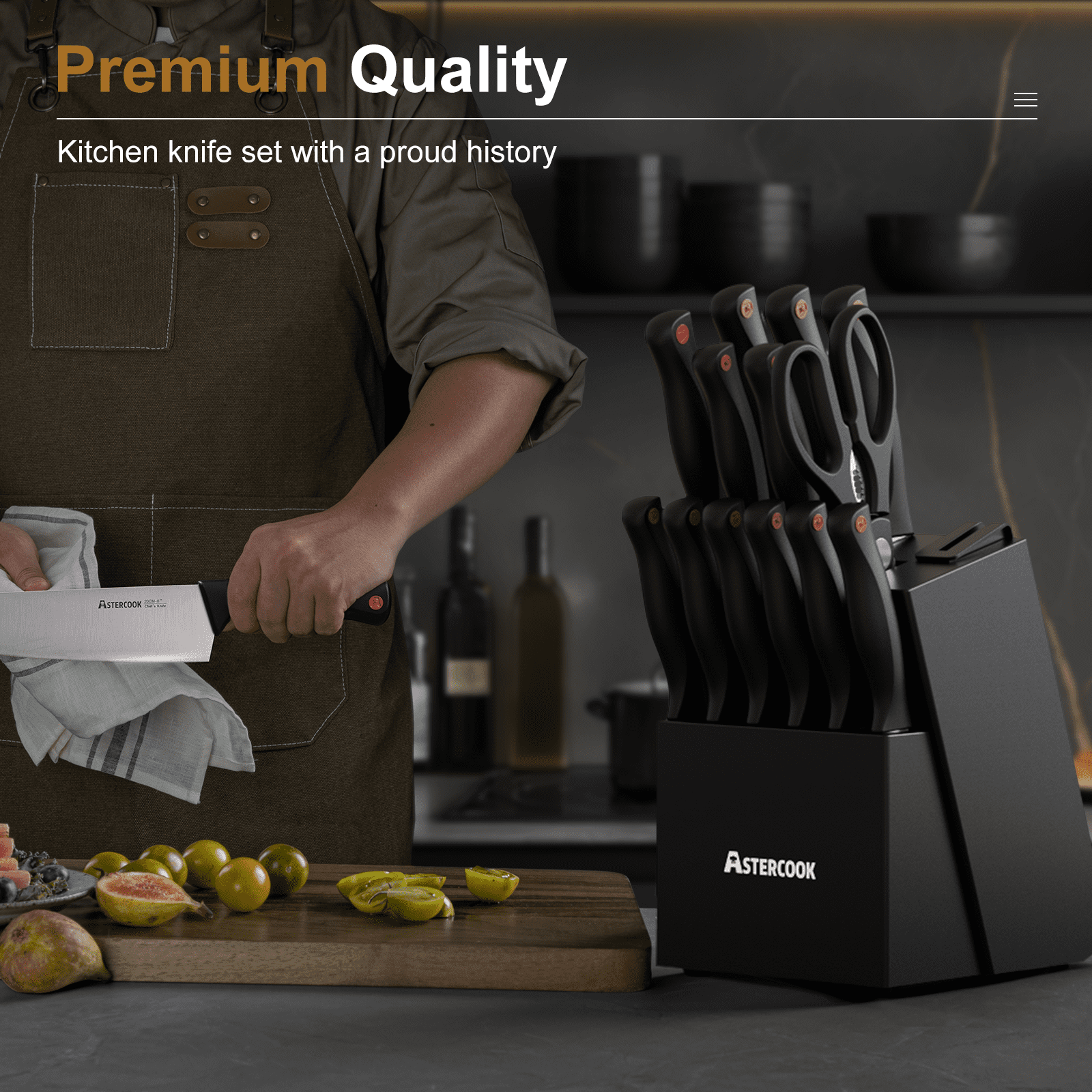Complete 14-Piece Knife Set: This all-in-one set includes: an 8″ Chef knife, 8″ Slicing knife, 7″ Santoku knife, 8″ Serrated bread knife, 5″ Utility knife, 3.5″ Paring knife, six 4.5″ serrated steak knives, kitchen shears, and a black hardwood knife block with a built-in sharpener.