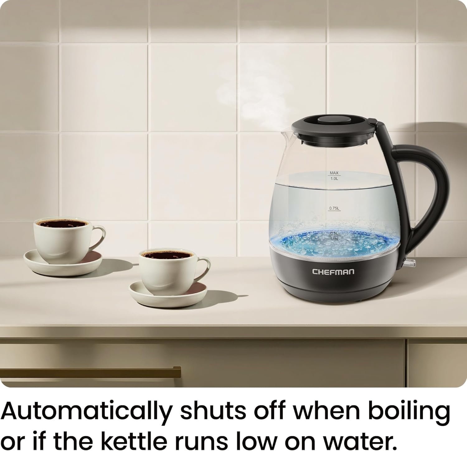 Chefman 1L Electric Glass Kettle w/ LED Indicator Light, Automatic Shutoff – Black