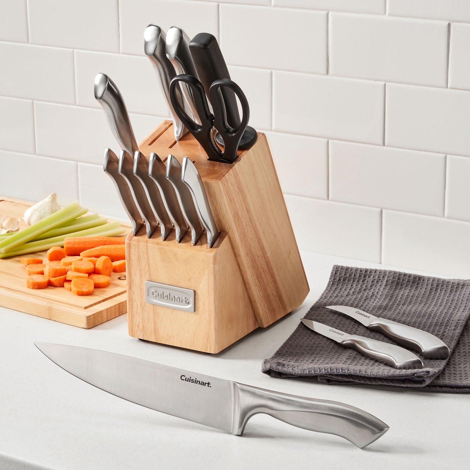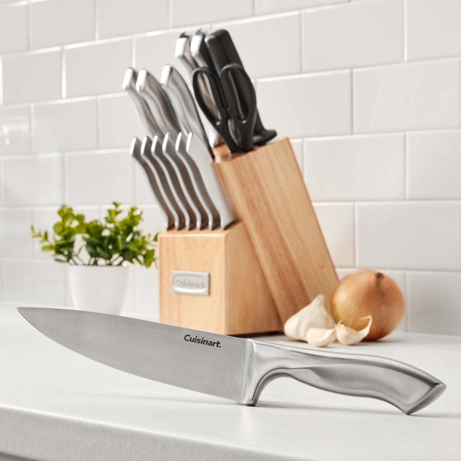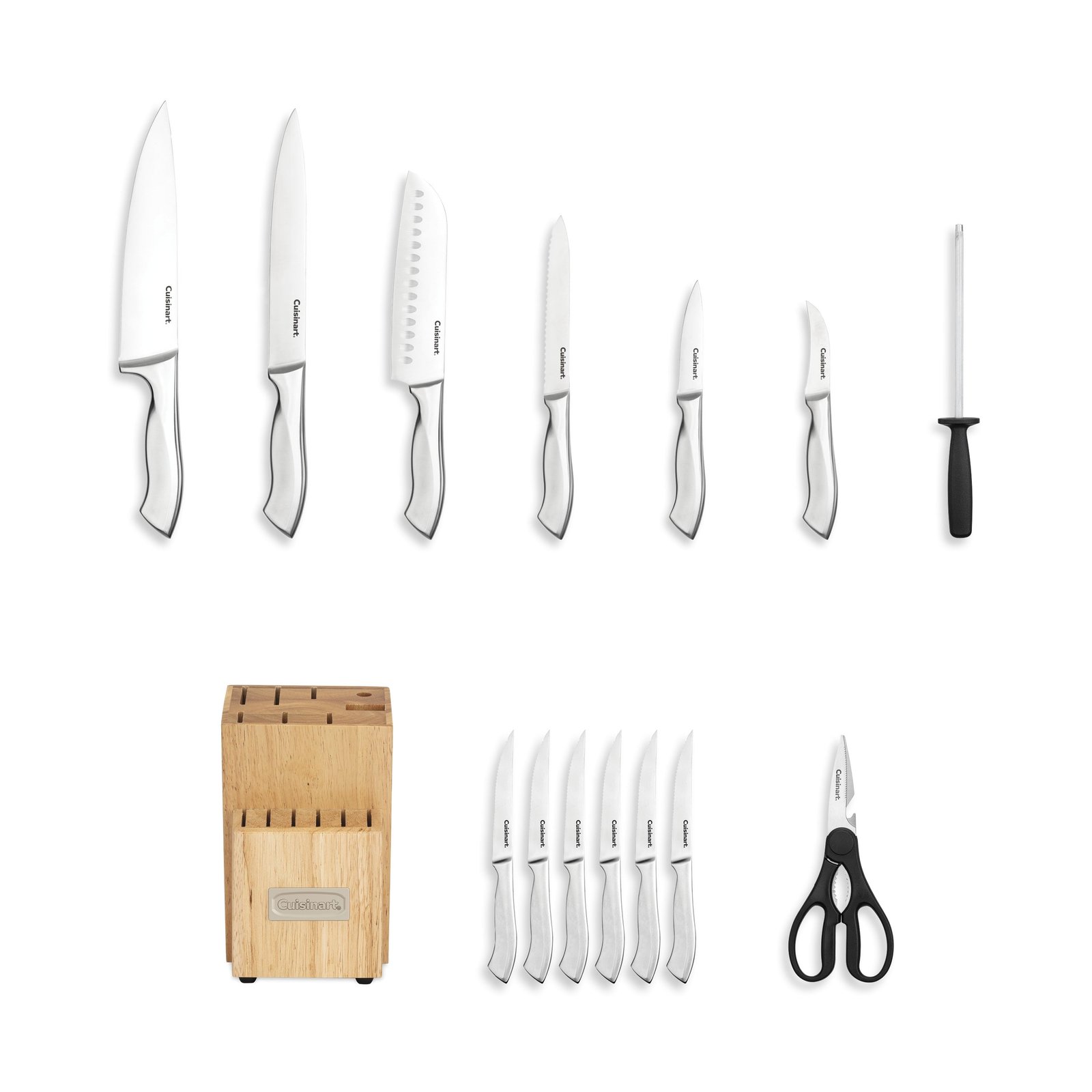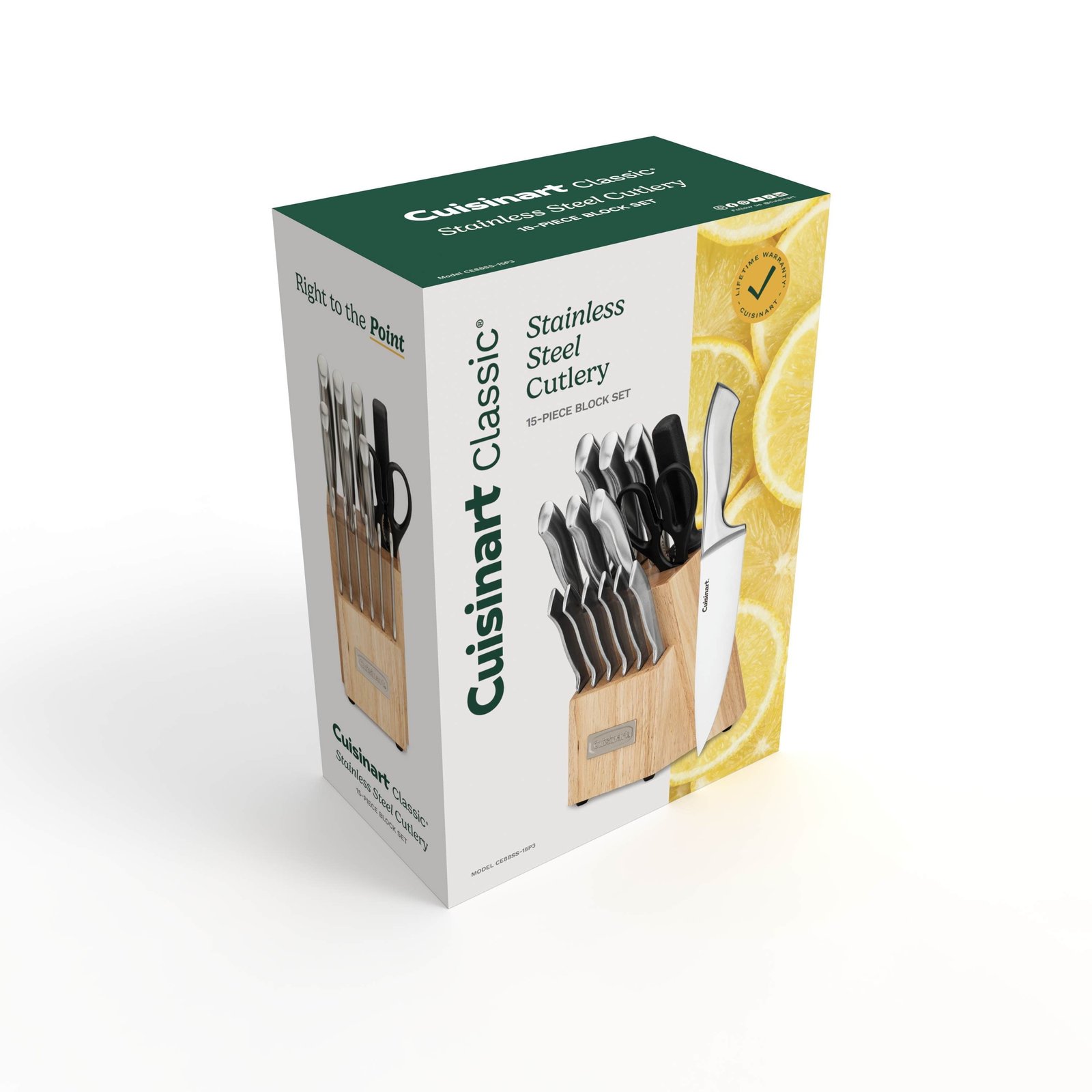 The Cuisinart Classic Stainless Steel 15-Piece Stainless Steel Knife Block Set delivers professional performance and style for cooks of all levels. Each knife is crafted from superior stainless steel for durability, sharpness, and precision. Ergonomically designed stainless steel handles provide a comfortable, controlled grip, while strong bolsters ensure balance and stability. This comprehensive set includes an 8” Chef Knife, 8” Slicing Knife, 7” Santoku Knife, 5.5” Serrated Utility Knife, 3.5” Paring Knife, 2.75” Bird’s Beak Paring Knife, six 4.5” Forged Steak Knives, 8” Sharpening Steel, and All-Purpose Shears—organized in a modern countertop wood block. Whether you’re prepping produce, slicing meats, or tackling detailed tasks, this set offers the tools you need. Backed by a lifetime warranty (excluding third-party sellers).