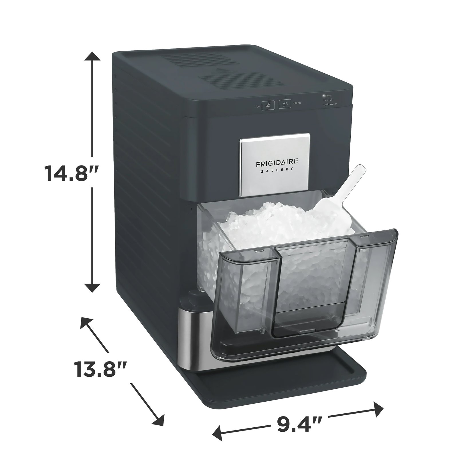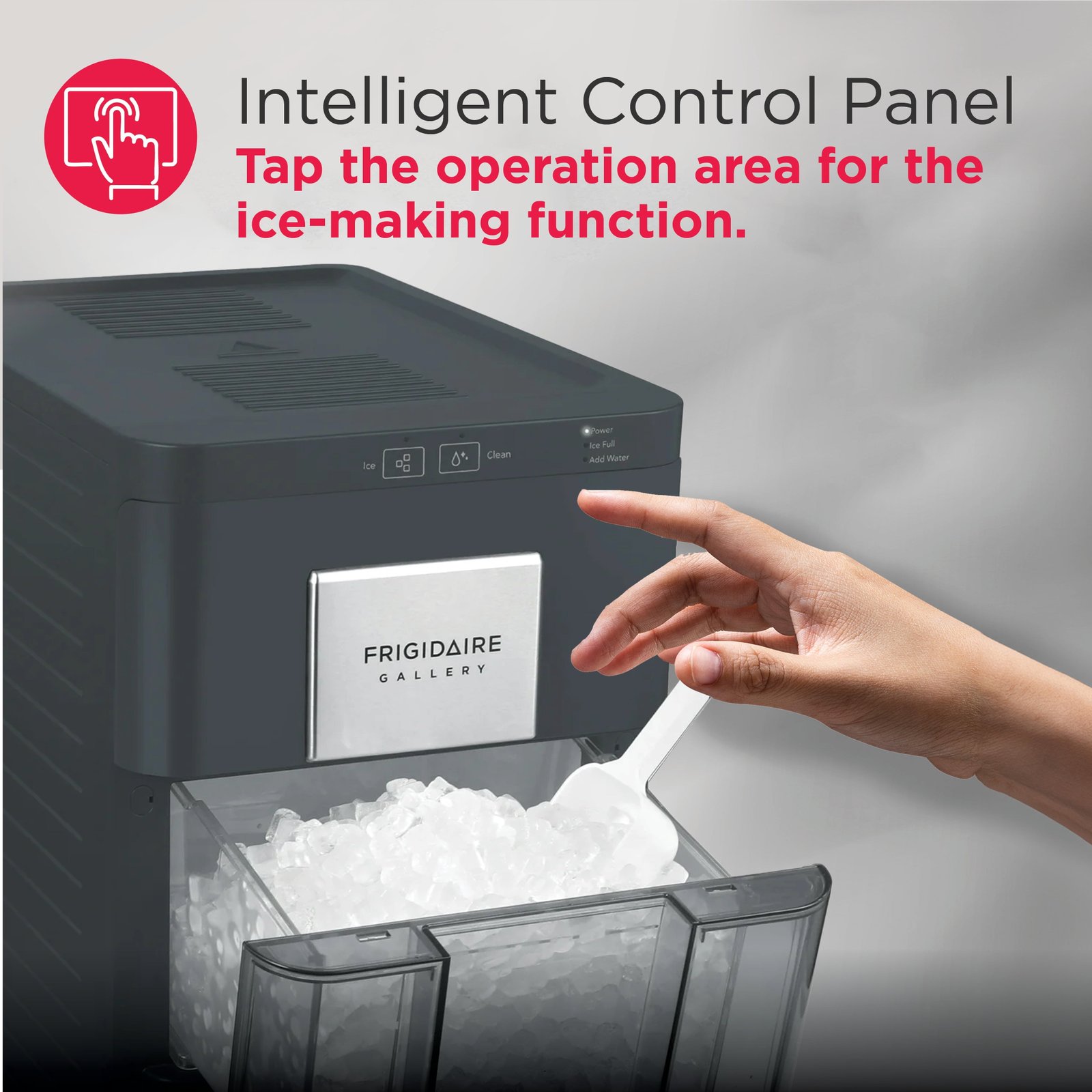 Introducing the Frigidaire Gallery Touch Control Nugget Ice Maker with a 33 lbs. capacity and stainless steel accent. Say goodbye to tough ice cubes and elevate your beverage experience with chewable nugget ice in the comfort of your own home. These unique soft yet crunchy nuggets float effortlessly in your favorite drinks, delivering a restaurant-quality experience. With its intelligent control panel, simply tap on the operation area to activate the ice-making function. Designed with convenience in mind, this ice maker features a drawer access and a viewing window, allowing everyone to catch a glimpse of the tantalizing ice that awaits. Its perfect size fits seamlessly on any countertop and can easily slide under kitchen cabinets. Plus, there’s no need for a water hookup—simply plug the machine into any standard 115V grounded electrical outlet and fill the reservoir with water. Enjoy a generous capacity of up to 3 lbs. (2.5 quarts) in the ice basket, ensuring an ample supply of ice whenever you need it. The self-cleaning function guarantees fresh-tasting ice every time. With an operating temperature range of F-50 to 104, this ice maker adapts to your cooling needs. Its sleek matt finish adds a touch of elegance to any kitchen decor. For added convenience, an ice scoop and drip tray are included, making serving and cleanup a breeze. Elevate your beverage experience with the Frigidaire Gallery Touch Control Nugget Ice Maker and enjoy the perfect chewable ice anytime, anywhere.