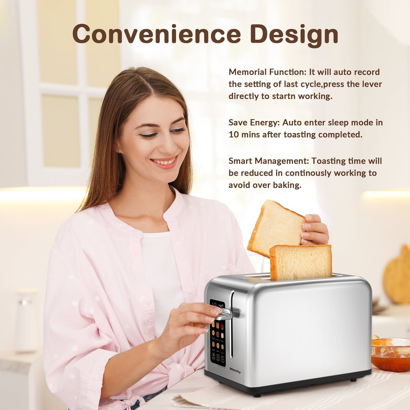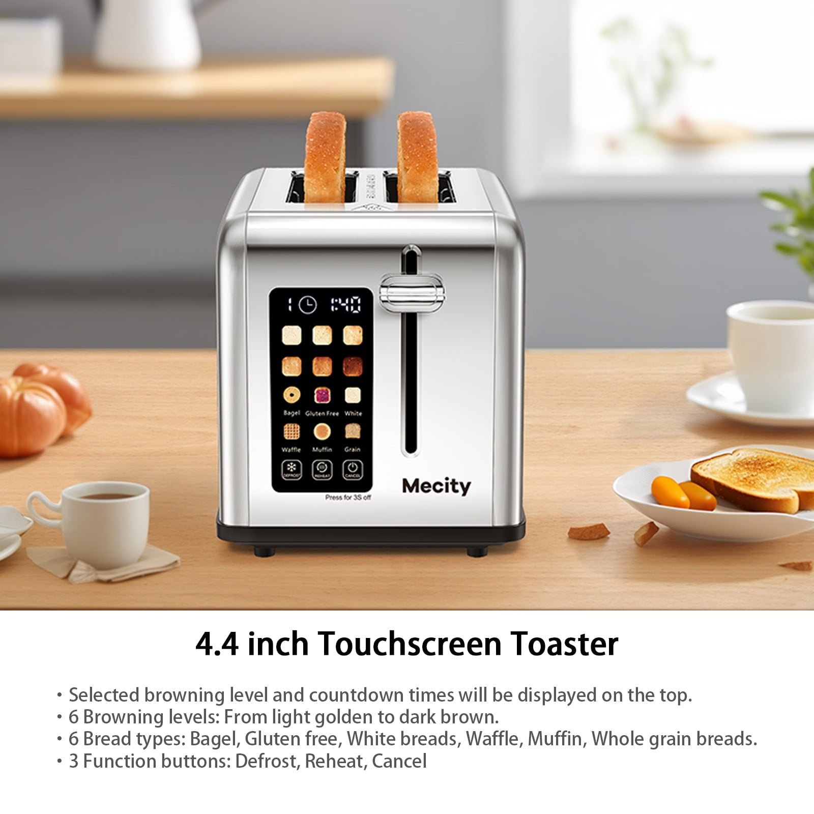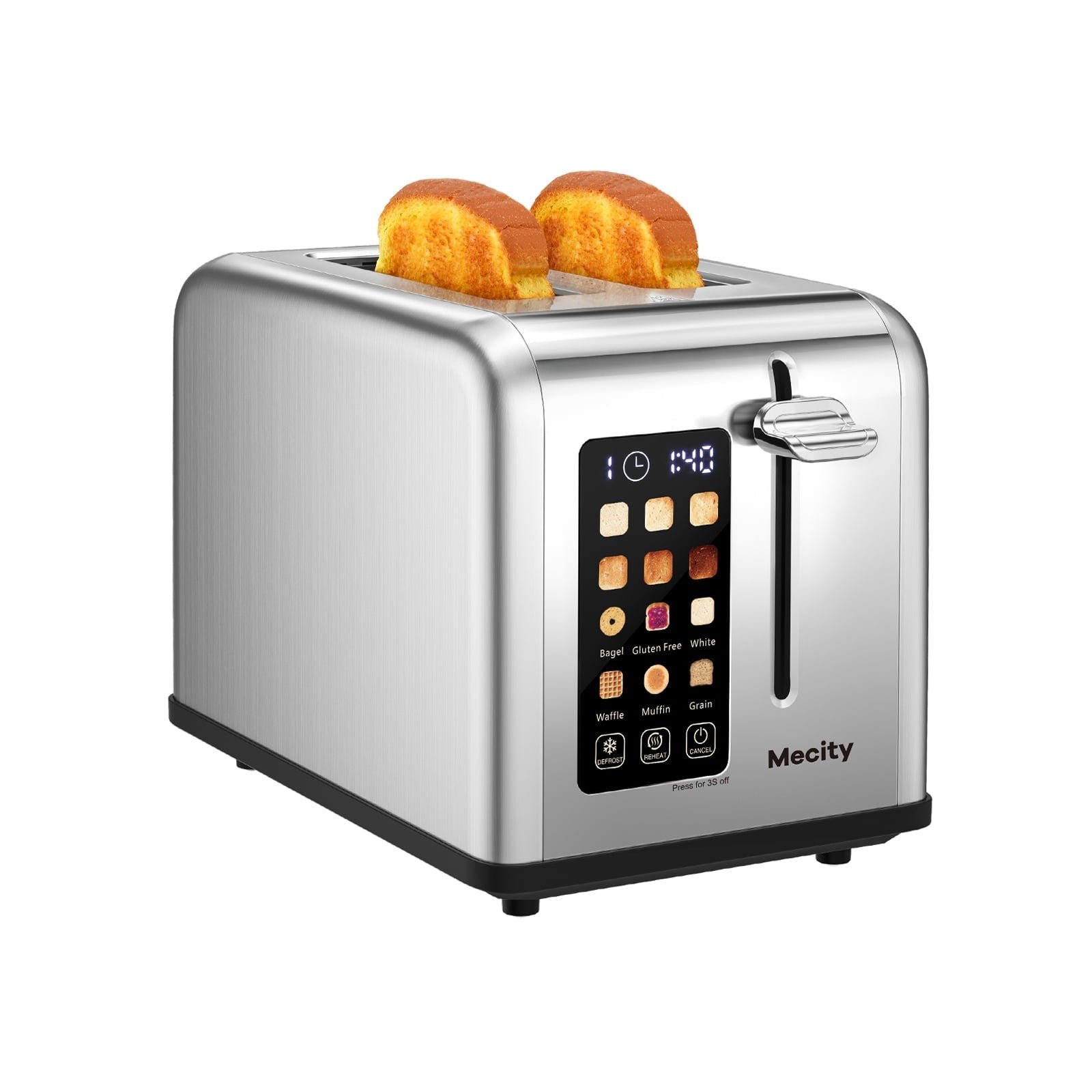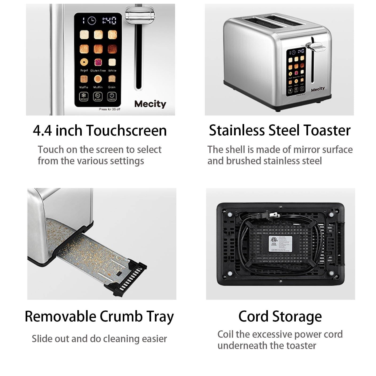 Mecity 2-Slice Touchscreen Toaster, Stainless Steel, 6 Shade Settings, Reheat, Cancel, Defrost, Removable Tray