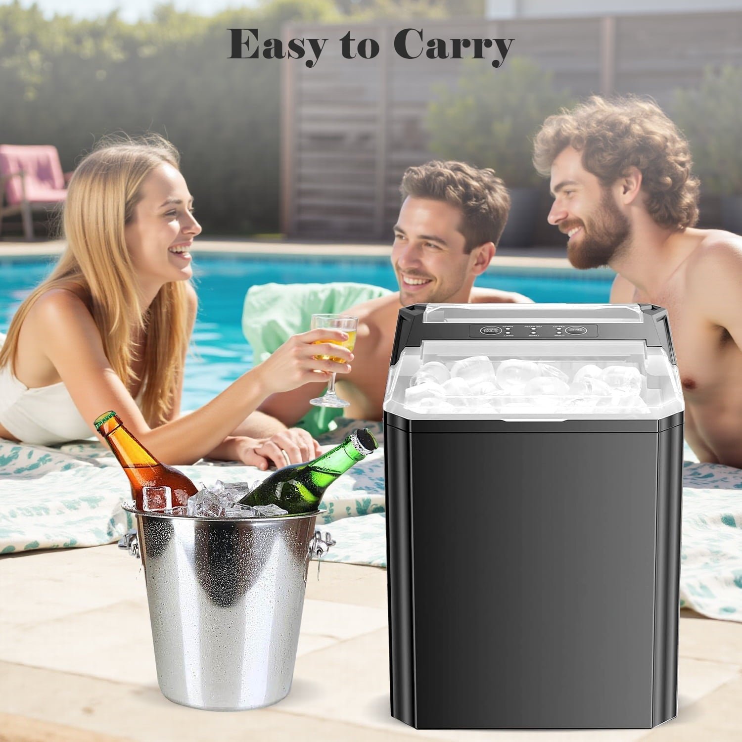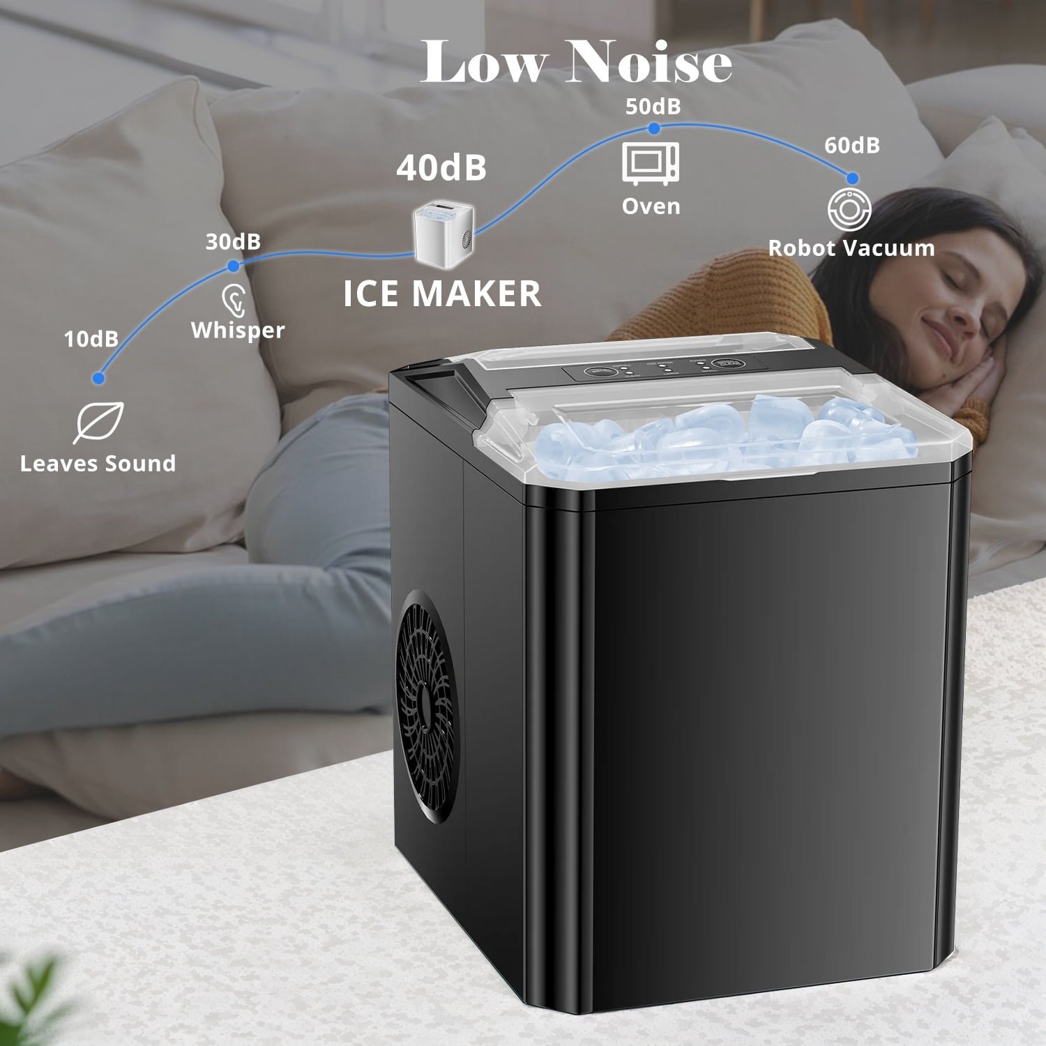 This portable countertop ice maker is designed for fast and efficient ice production, making 9 bullet-shaped ice cubes in just 6 minutes. With a 1.2L water tank, it can produce up to 26.5 lbs of ice in 24 hours, ensuring a constant supply of ice for your needs. You can choose between two sizes of smooth, bullet-shaped ice cubes. The self-cleaning function allows for easy maintenance with a simple press of the on/off button, keeping your ice clean and ready to use. Compact and portable, this ice maker fits perfectly in your kitchen, office, bar, or RV. Its smart control panel offers simple operation, including indicator lights for low water or a full ice basket, and it operates quietly. The package includes an ice scoop and a removable ice basket for added convenience.
