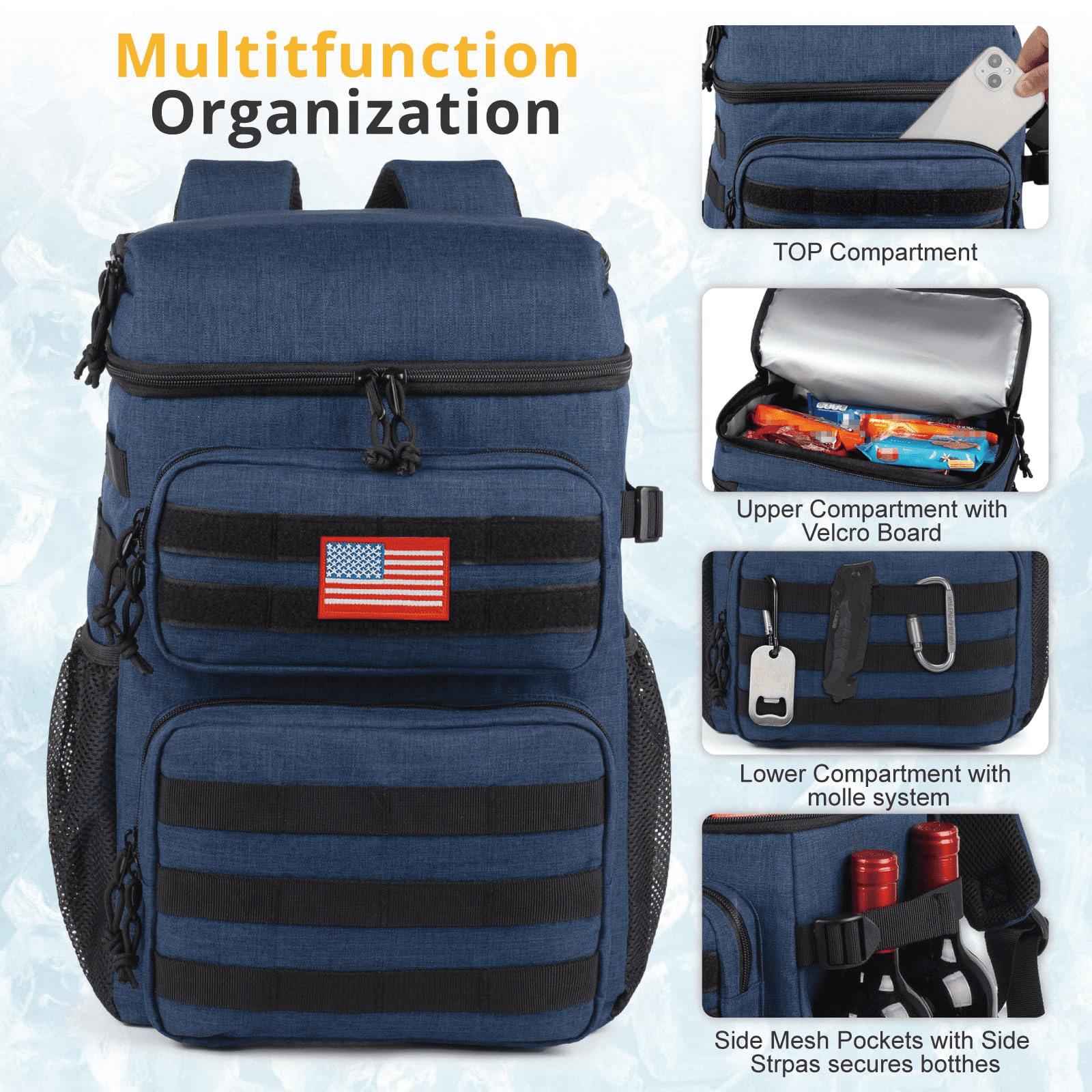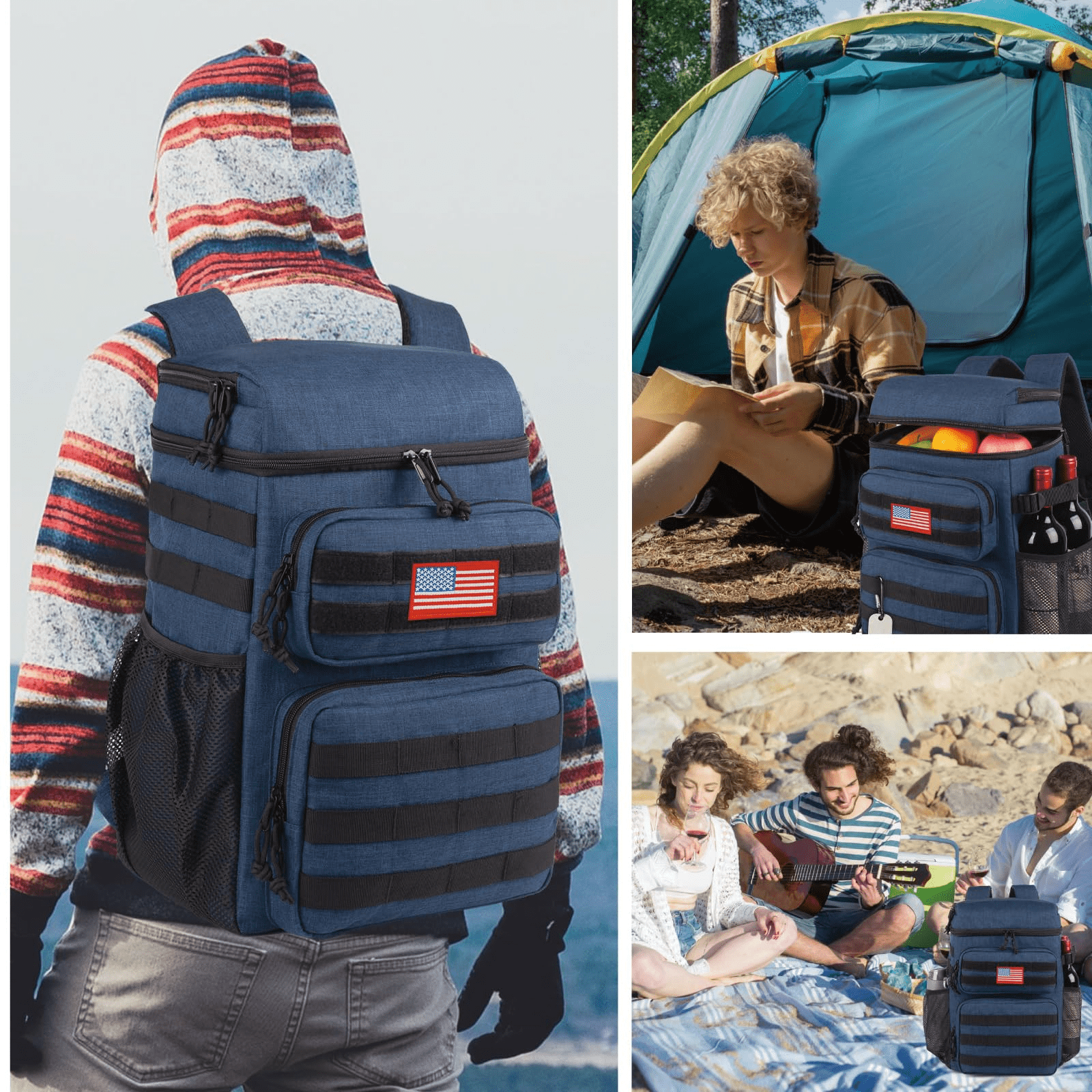 and Functional Design:Featuring webbing on the front and side, customize your carrying options as per your preference. Our practical cooler includes a flag patch, an eagle with an American flag patch, a carabiner, and a removable bottle opener for added convenience. Straps at the bottom are perfect for packing a blanket, enhancing your outdoor dining experience.