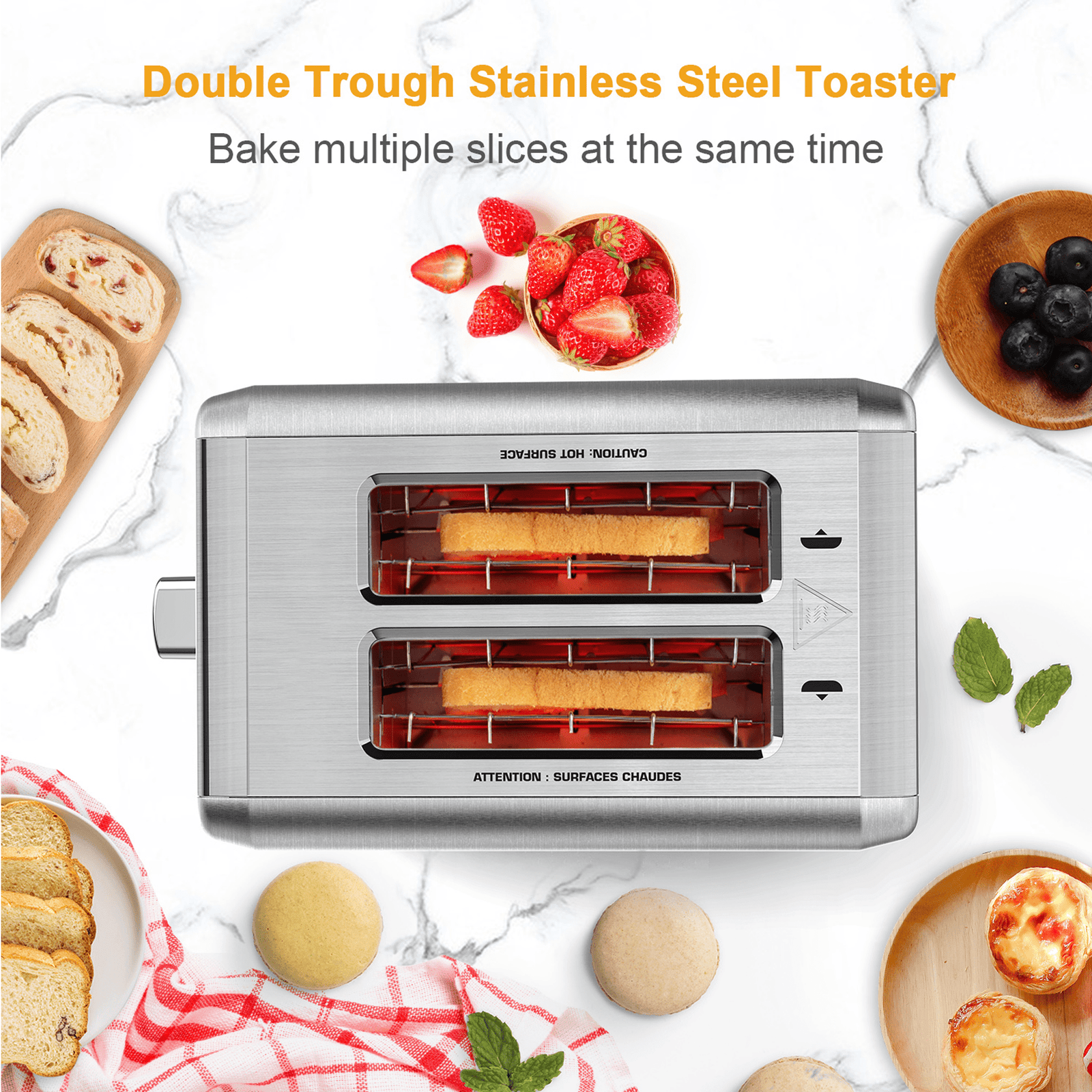 Even Toasting: The self-adjusting bread carriage and bidirectional surround heating technology ensure even toasting and prevent uneven browning.